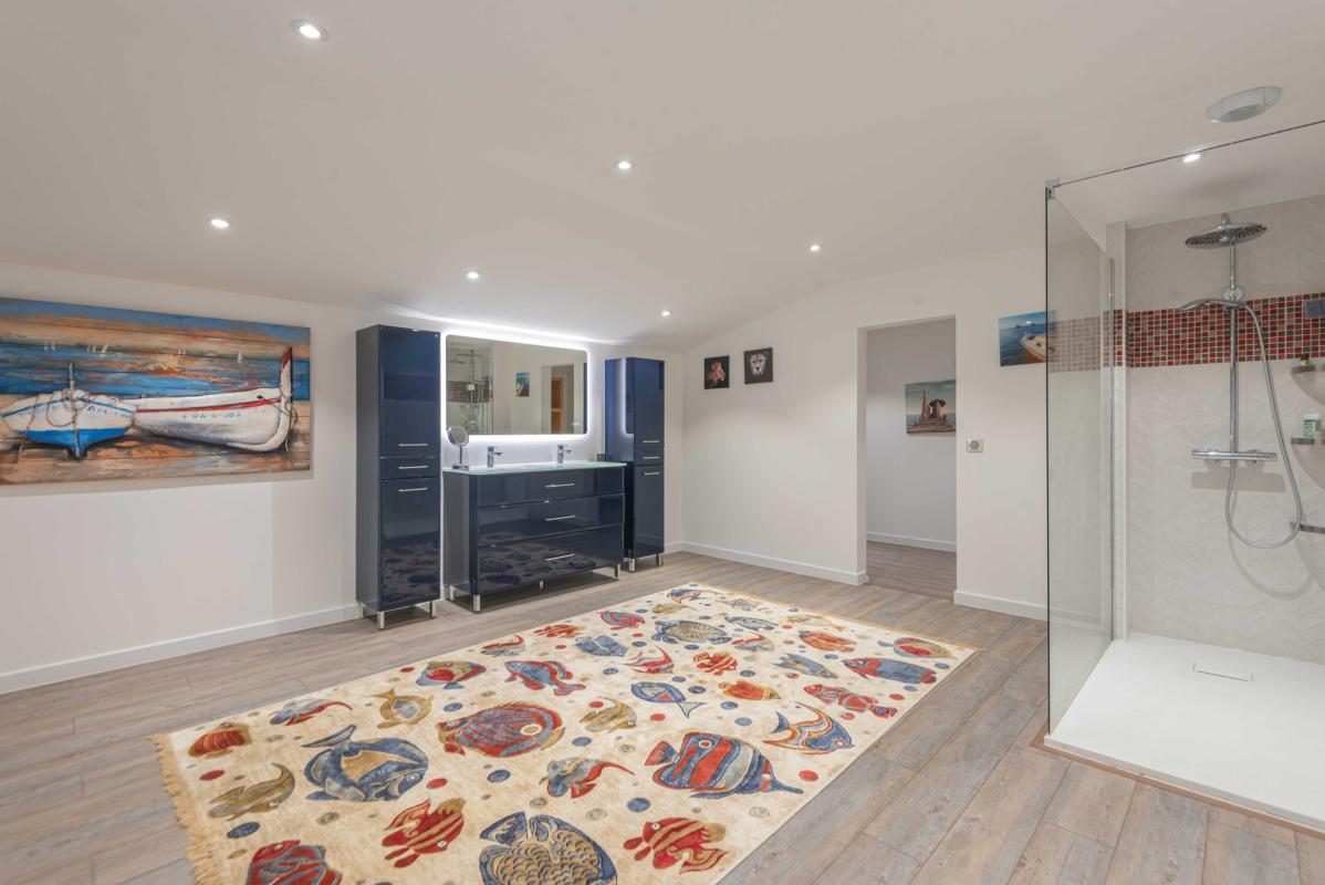 325 m2 de surfaces habitables sur 2 niveaux. Elle dispose au rez-de-chaussée d’un vaste séjour de 90 m2, une cuisine professionnelle, une grande buanderie, une salle d’eau et un WC.