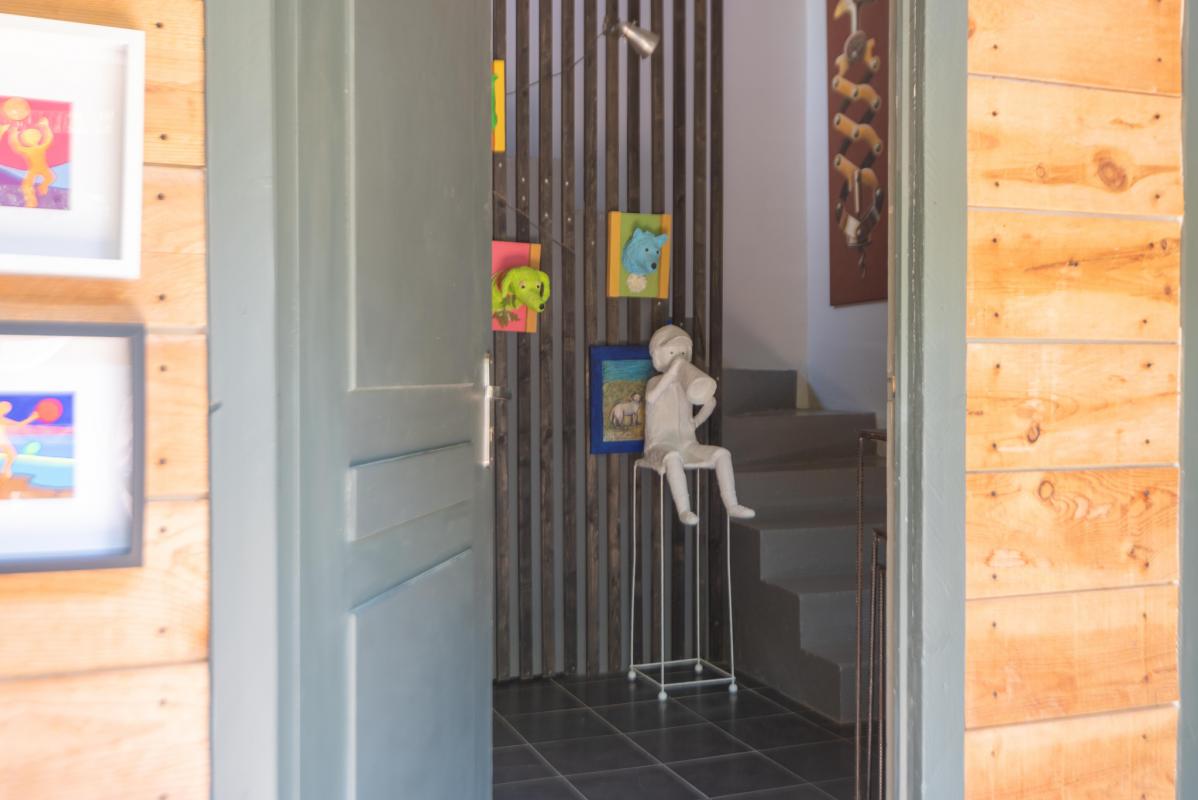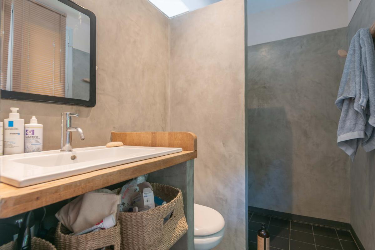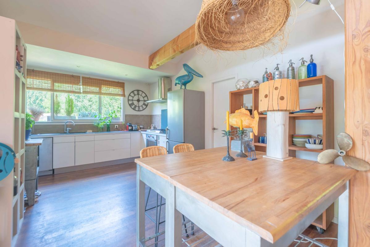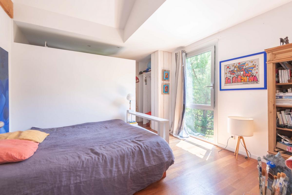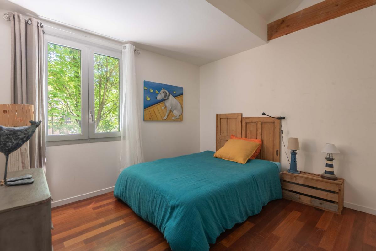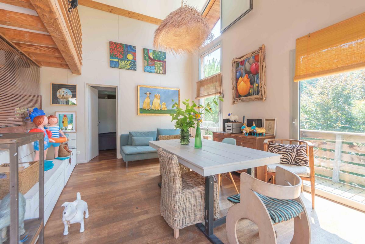 À l’étage, la pièce de vie baignée de lumière séduit par sa double hauteur sous plafond, sa magnifique charpente traditionnelle apparente et ses larges ouvertures donnant sur deux terrasses. L’une, orientée plein sud, permet de profiter pleinement du soleil et de la vue sur les arbres ; l’autre, au nord, idéale pour les repas à l’ombre en été.