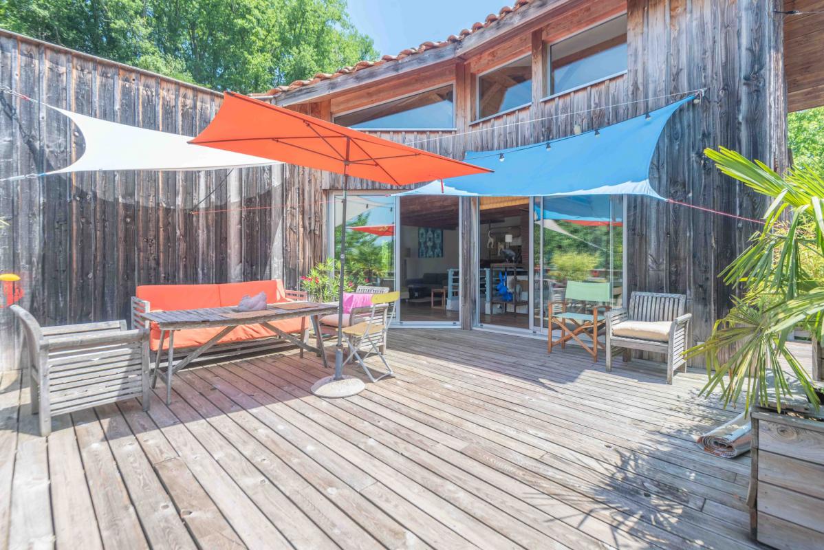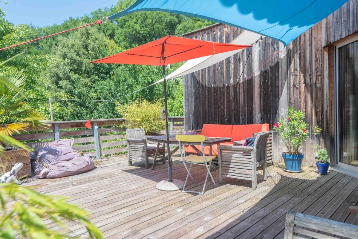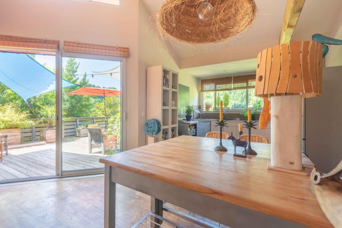 10MN DE QUINSAC IMMOBILIER RIVA vous propose, au coeur d’un environnement naturel surprenante, cette maison d’architecte arypique en bois, sur deux niveaux, alliant charme, fonctionnalité et volumes généreux.