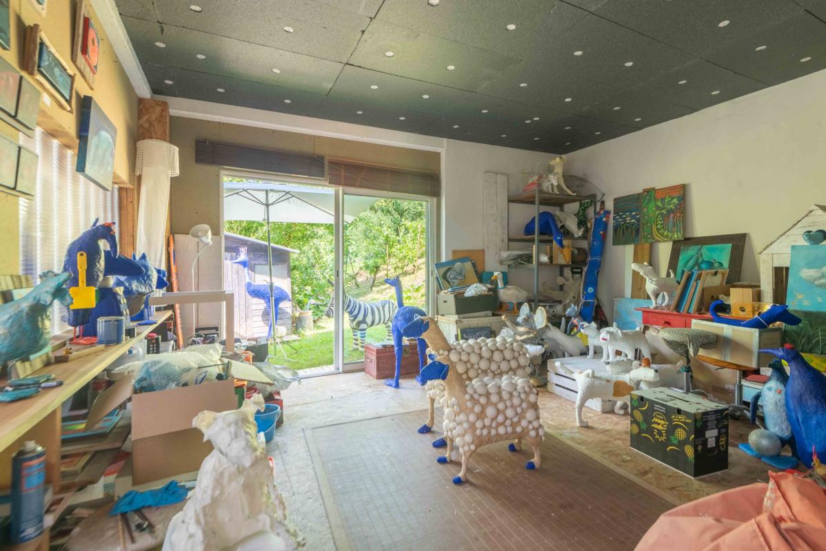 Au rez-de-chaussée, vous découvrirez une vaste entrée avec escalier central, WC indépendant, cellier, ainsi qu’un espace polyvalent de type atelier, facilement transformable en chambre ou en studio indépendant selon vos besoins. De l’autre côté, vous trouverez un grand espace pouvant servir de débarras ou d’atelier de bricolage.