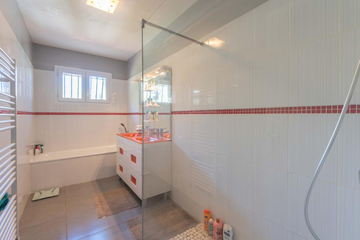 Elle propose un espace de vie lumineux avec une entrée, salon-séjour et cuisine moderne entièrement équipée (50 m2) prolongé par une véranda de 23 m2 ainsi que 4 chambres dont une plus petite de 8.47m2 idéale pour un bureau ou une chambre d’appoint.