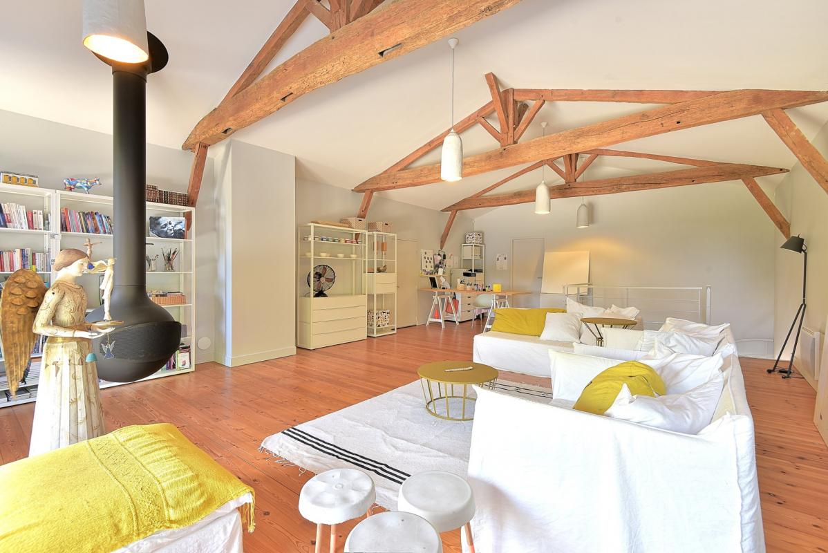 10 MN de LATRESNE – CENTRE BOURG – PROCHE COMMERCES ET BUS – IMMOBILIER RIVA vous propose cette magnifique MAISON EN PIERRE du milieu du 19ème siècle située à proximité des commerces. D’une surface d’environ 300 m2 environ sur un parc arboré d’environ 4550 m2, elle est pourvue d’un préau ancien de 142 m2 et d’un carport pour 4 voitures. Elle comprend un grand salon traversant de 81 m2 et sa cuisine ouverte, un second salon très cosy au 1er étage avec cheminée suspendue Focus, 5 chambres, bureau/6ème chambre (18 m2), salle d’eau et salle de bain+douche, buanderie, 3 wc. Construction ou Extension possible. Piscinable. Vous apprécierez les volumes, la luminosité et les perspectives sur les oliviers dans le parc. Possibilité d’aménager un appartement indépendant de 59 m2 (salon, chambre, cuisine, salle d’eau, wc). Grenier isolé (rangement, cave à vin…). Piscinable. Pas de vis-à-vis.