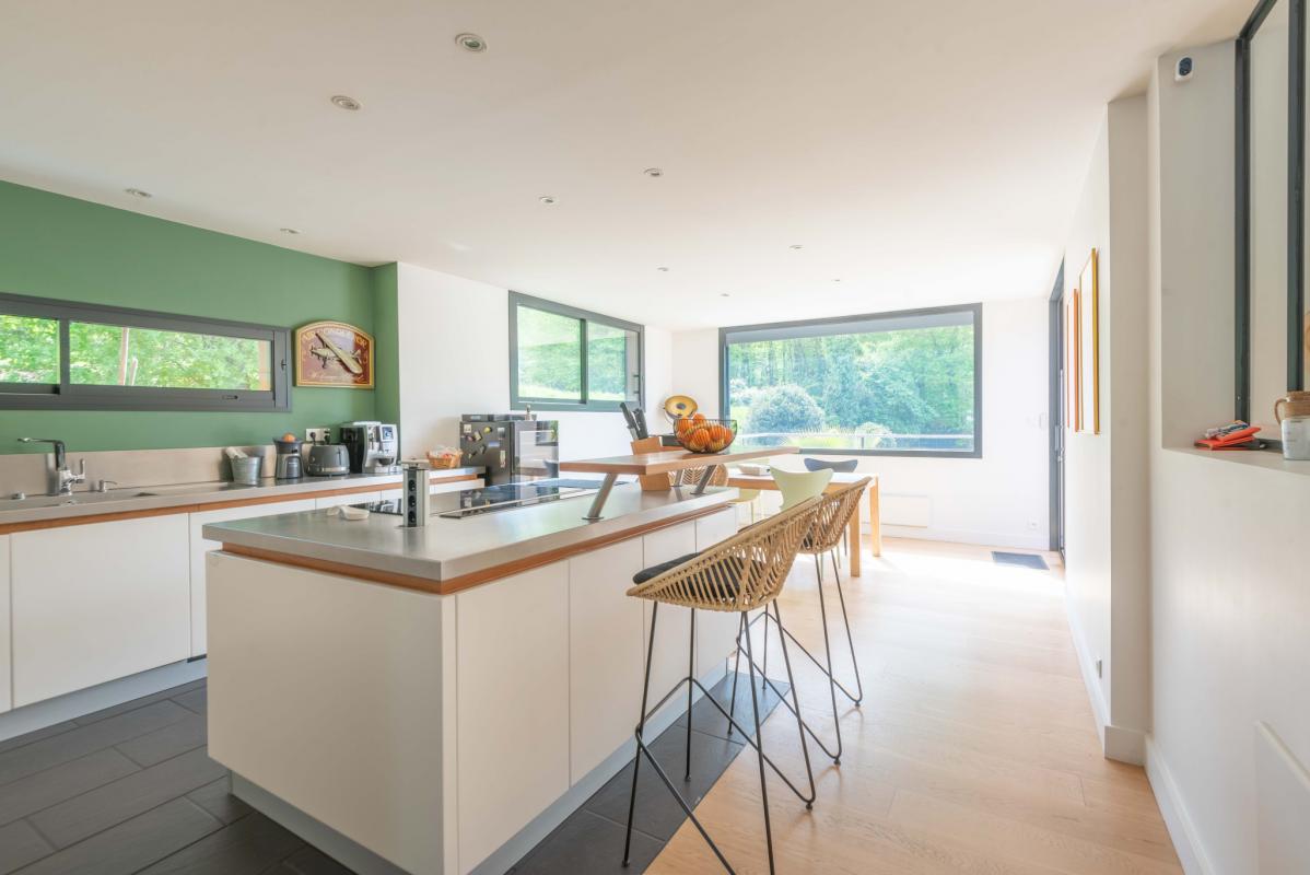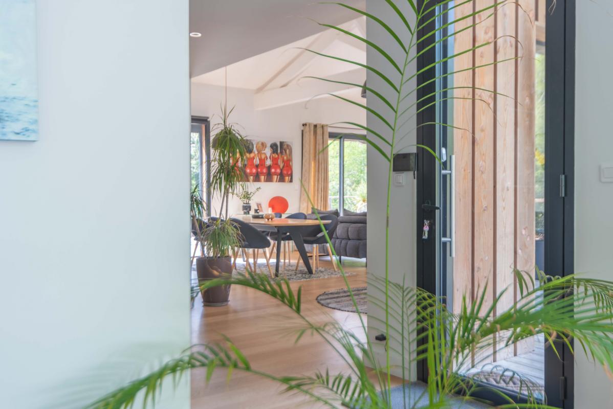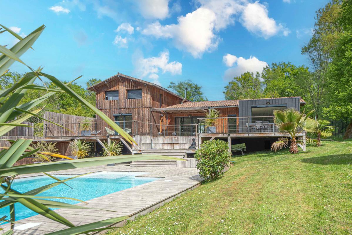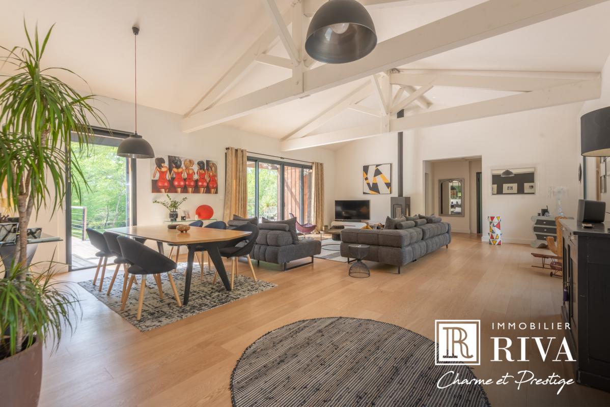 Proche LATRESNE – IMMOBILIER RIVA vous propsose cette belle maison en bois, vous serez conquis par l’ambiance sereine du lieu, baignée de lumière et entièrement tournée vers la nature offrant bureau, beaux volumes salon séjour, cuisine equipée, salon TV, WC, 4 chambres dont une suite parentale avec dressing, salle de bains et 3 salles d’eau, WC. Un grand garage au sous-sol ainsi qu’un autre bureau indépendant de la maison. Terrasse chaleureuse avec vue dégagée sur le jardin. Piscine chauffée sur terrain arboré de 2730 m2. Un lieu de quiétude. RARE. Prestations de qualité.