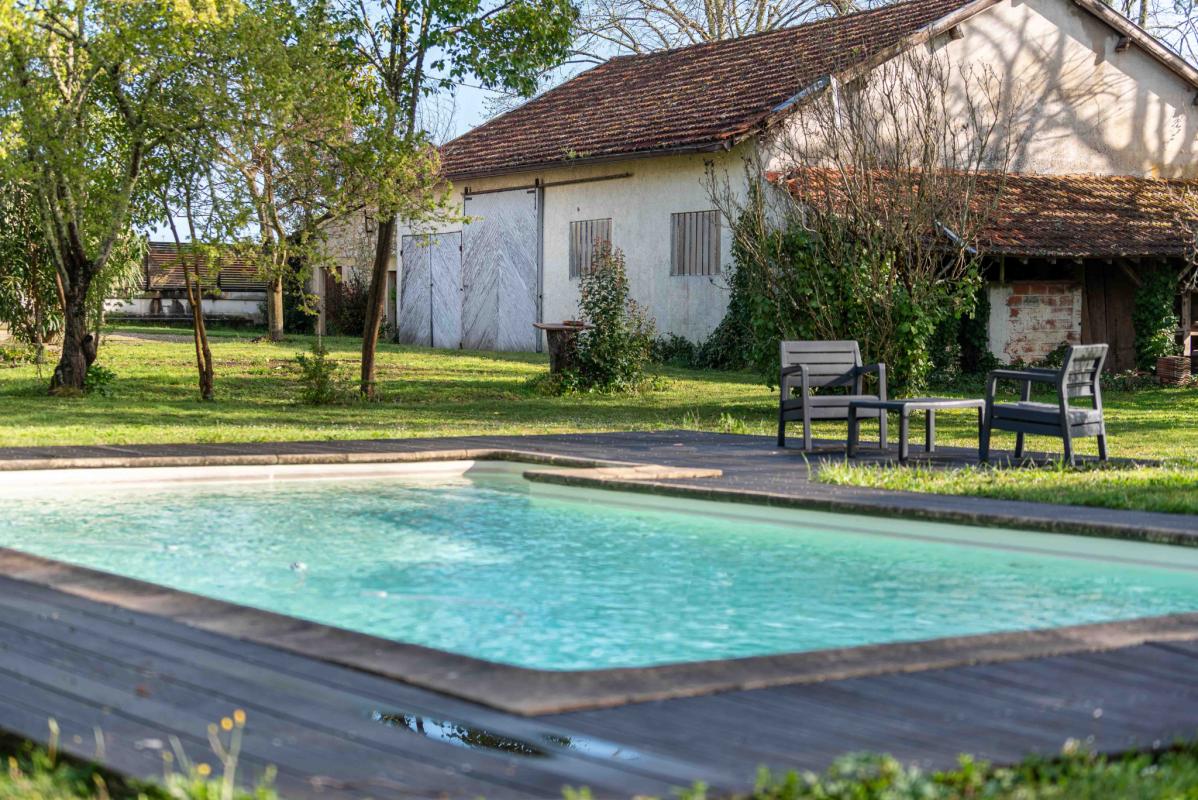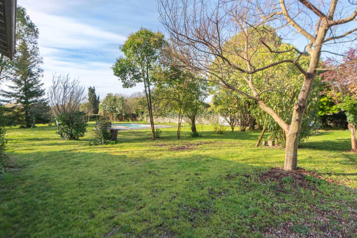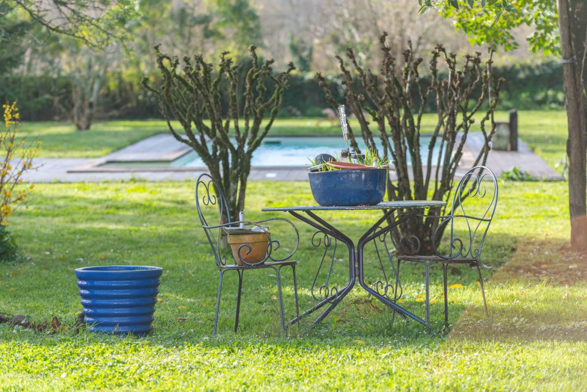 À l’extérieur, le parc arboré et intimiste s’ouvre devant la maison et permet de profiter pleinement de la piscine, dans un cadre calme et verdoyant.