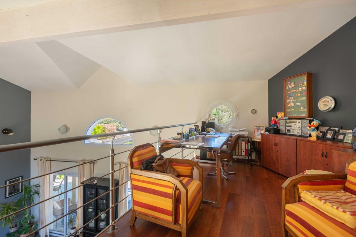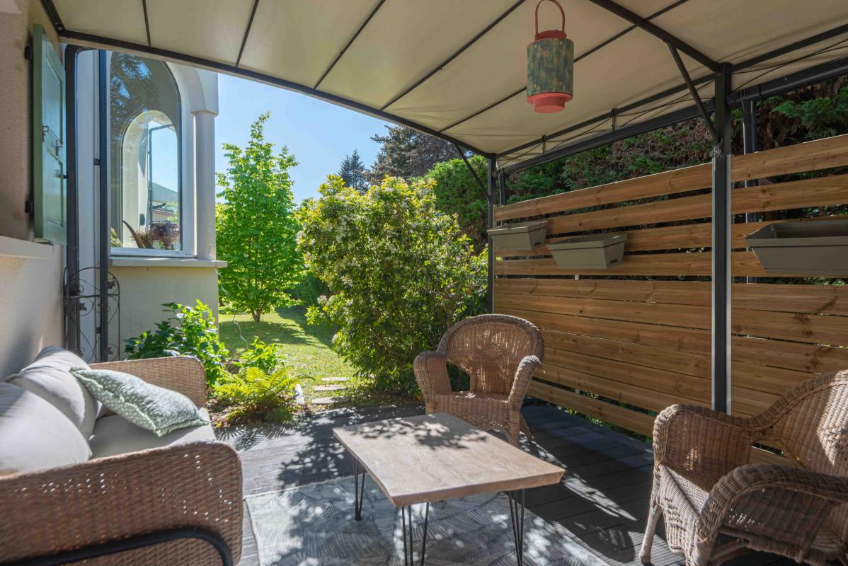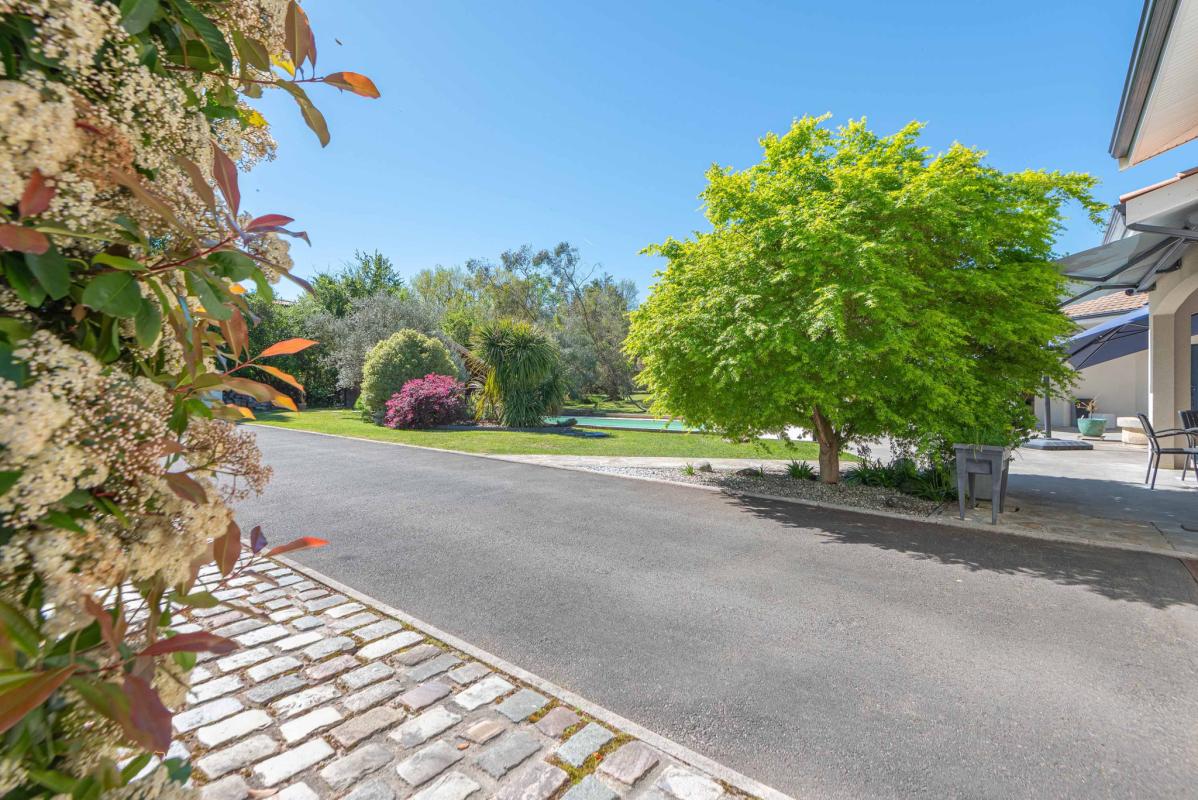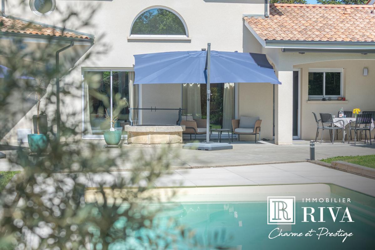Autour de la piscine au sel (9 x 4.70m) récente, les extérieurs ont été pensés comme un véritable cocon : végétation soignée, terrasses élégantes et matériaux harmonieux, avec un chalet en bois qui fait face à la maison. Panneaux Photovoltaïques pour alimenter la pompe de la piscine. Aucune vis-à-vis.