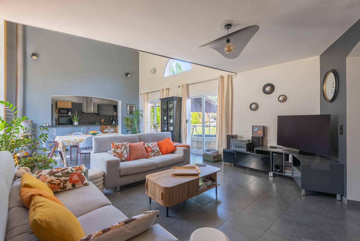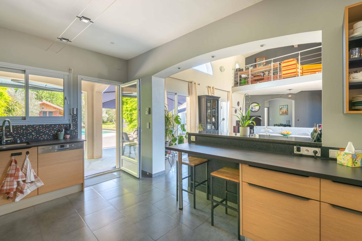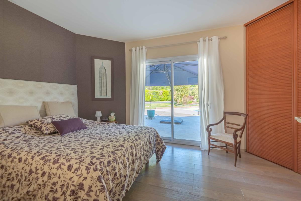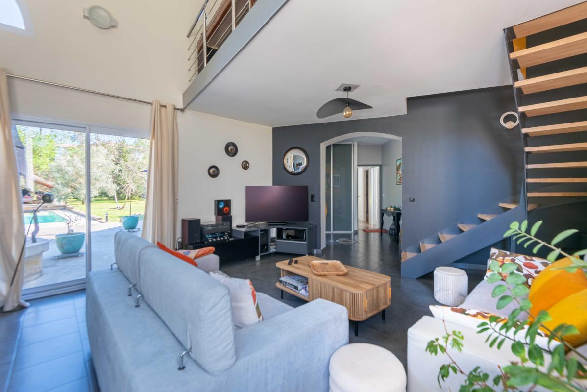 Autour de la piscine au sel (9 x 4.70m) récente, les extérieurs ont été pensés comme un véritable cocon : végétation soignée, terrasses élégantes et matériaux harmonieux, avec un chalet en bois qui fait face à la maison. Panneaux Photovoltaïques pour alimenter la pompe de la piscine. Aucune vis-à-vis.