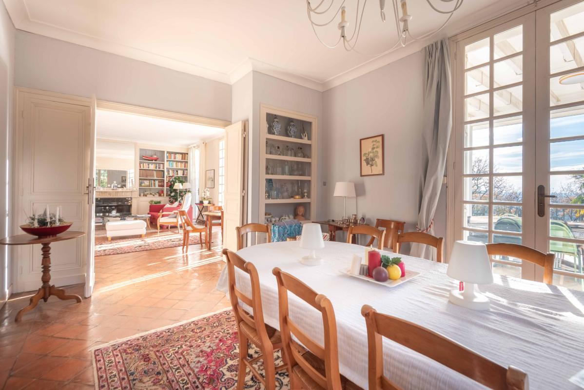Au rez-de-chaussée, un vaste séjour et salle à manger lumineux de 70 m2 exposé plein sud, ouvert sur une terrasse panoramique de plus de 100 m2, véritable prolongement de l’espace de vie. Cuisine équipée indépendante avec coin dinatoire. Très belle hauteur sous plafond. Belles tomettes dans l’entrée.